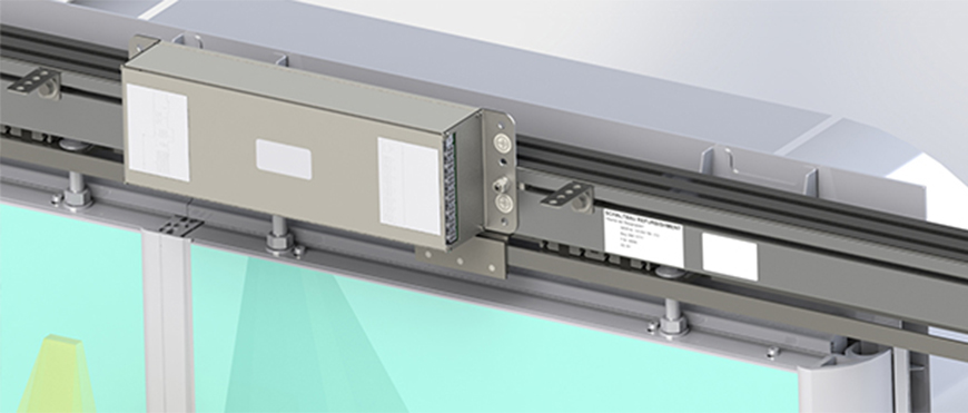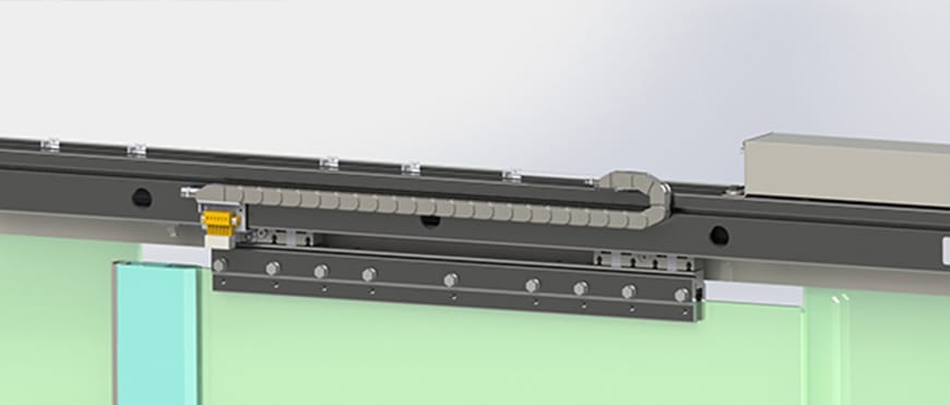Innentür mit pneumatisch angetriebenem Türantrieb. Der Türantrieb ist modular aufgebaut und kann durch ein flexibles Baukastensystem individuell an die Kundenforderung designed werden. Der Antrieb besteht aus einem speziellen Au-Profil welches in der Länge ohne Konstruktionsänderungen angepasst werden kann. Die Bauweise garantiert ein geringes Gewicht bei gleichzeitiger hoher Tragkraft für die Türblätter.